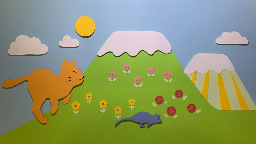 “Cat-ch me!” is a papercraft animation featuring a cat chasing a mouse in stop-motion. This child-oriented animation comprises 408 colourful images, vividly capturing the cat's playful movements across diverse scenes from urban streets to country roads. The crafting process encompasses paper cutting, pasting and crafting, and photo shooting.